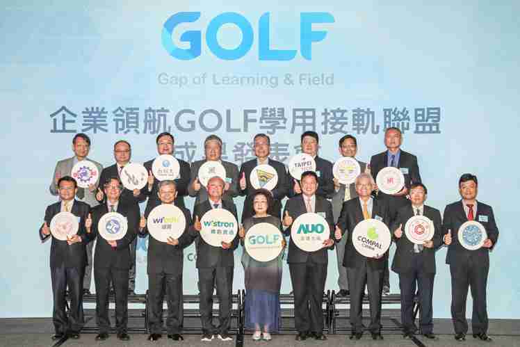 GOLF学用接轨联盟集结企业和学校的力量,,打造「学用合一、、、、产学接轨」的创新合作平台 (前排左起:淡江大学副校长何启东、、、元智大学校长林启瑞、、纬育执行长许延岳、、、、纬创总经理暨执行长黄柏漙、、、教育部政务次长范巽绿、、、、口袋牛店董事长暨执行长彭双浪、、仁宝总经理暨执行长翁宗斌、、、、大同大学校长何明果、、圣约翰科大校长艾和昌;后排左起:明新科大校长林启瑞、、龙华科大校长葛自祥、、、台湾科大校长廖庆荣、、中兴大学副校长郑政峯、、、、中央大学校长周景扬、、台北科大副校长任贻均、、中华科大副校长石大明、、、明志科大校长刘祖华)
